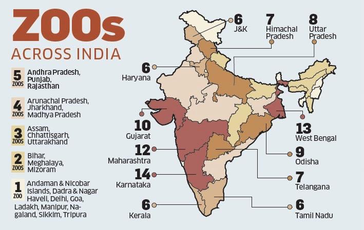 The CZA has recognised 155 zoos in India under the Wildlife (Protection) Act, 1972. Out of these, 18 are classified as large zoos, 24 as medium, 41 as small and 58 under the category of mini zoos.
